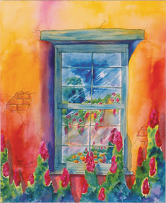 "Outside The Blue Door" 30x38 • Watercolor on Paper • Collection of the City of Bloomfield
