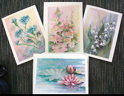 ![]() ![]() ![]() ![]() ![]() These 8 blank greeting cards are size 4 1/2” X 6” and come with 8 white envelopes in a nice self-sealing clear acetate bag. If a clear acetate box is preferred just let me know. Each card is printed on 110 lb white card stock and is a reproduction of my original watercolor painting. The Summer I Flower Collection Set contains two cards each of the following images: Bachelor Buttons, Hollyhock, Lily of the Valley, and Waterlily. This set is $10 and is available at my Etsy Store. |