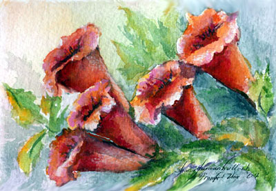 ![]() ![]() ![]() ![]() ![]() These 8 blank greeting cards are size 4 1/2” X 6” and come with 8 white envelopes in a nice self-sealing clear acetate bag. If a clear acetate box is preferred just let me know. Each card is printed on 110 lb white card stock and is a reproduction of my original watercolor painting. The Summer II Flower Collection Set contains two cards each of the following images: Marigold, Stargazer Lily, Sunflower, and Trumpet Vine. This set is $10 and is available at my Etsy Store. |